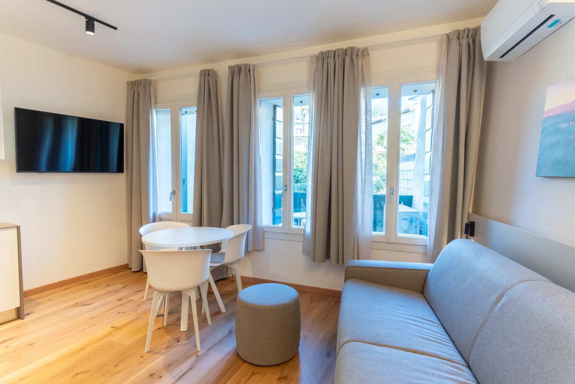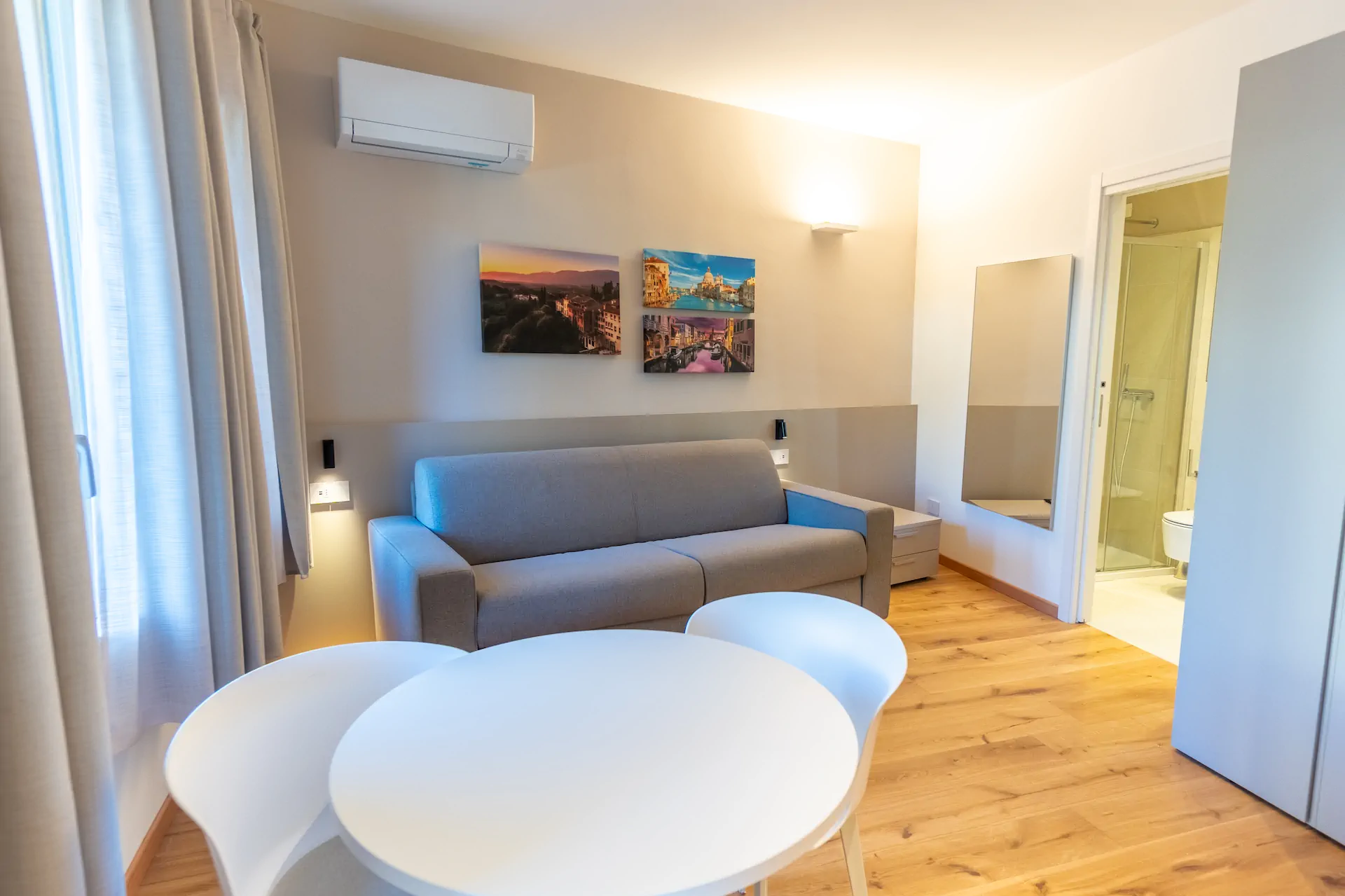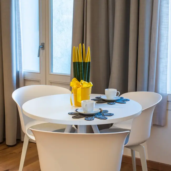 Il cuore di questo appartamento è la zona living open space, caratterizzata da ampie finestre che garantiscono luce naturale durante tutta la giornata. Il tavolo rotondo, il divano e l’area relax sono disposti in modo armonioso, creando uno spazio fluido e piacevole da vivere. I colori neutri e i materiali naturali contribuiscono a un’atmosfera calma e ordinata, perfetta per rilassarsi dopo una giornata ad Asolo.