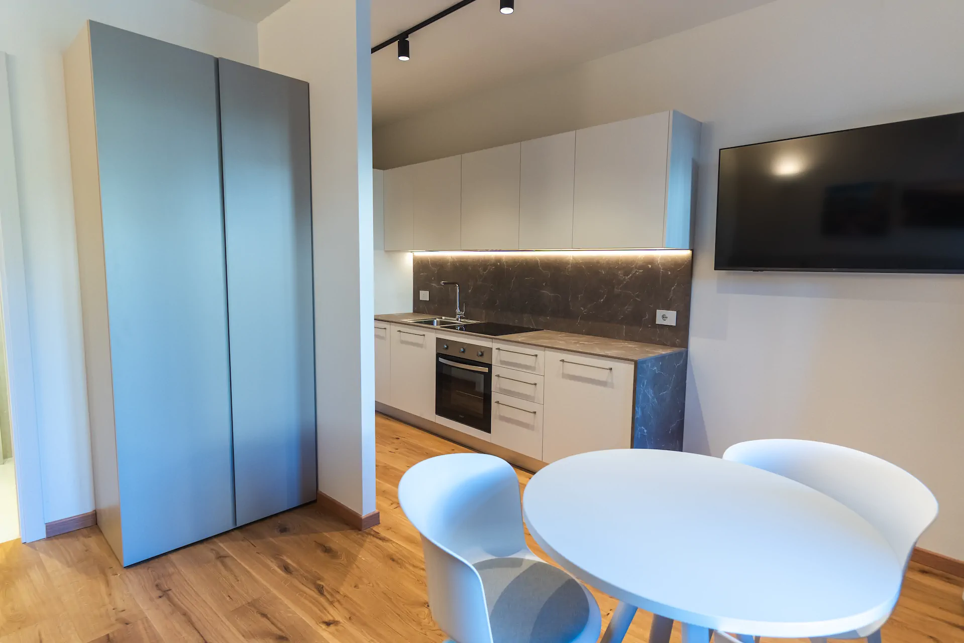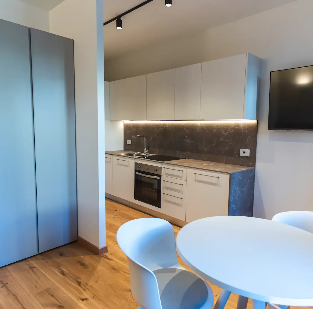 La cucina è moderna, lineare e completamente attrezzata. Dotata di piano cottura, forno, frigorifero e lavastoviglie, consente di gestire il soggiorno in totale autonomia. Le finiture pulite e la disposizione razionale rendono lo spazio pratico e intuitivo, adatto sia a soggiorni brevi che a permanenze più lunghe.