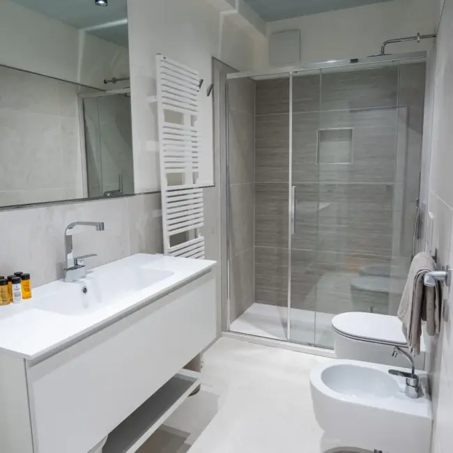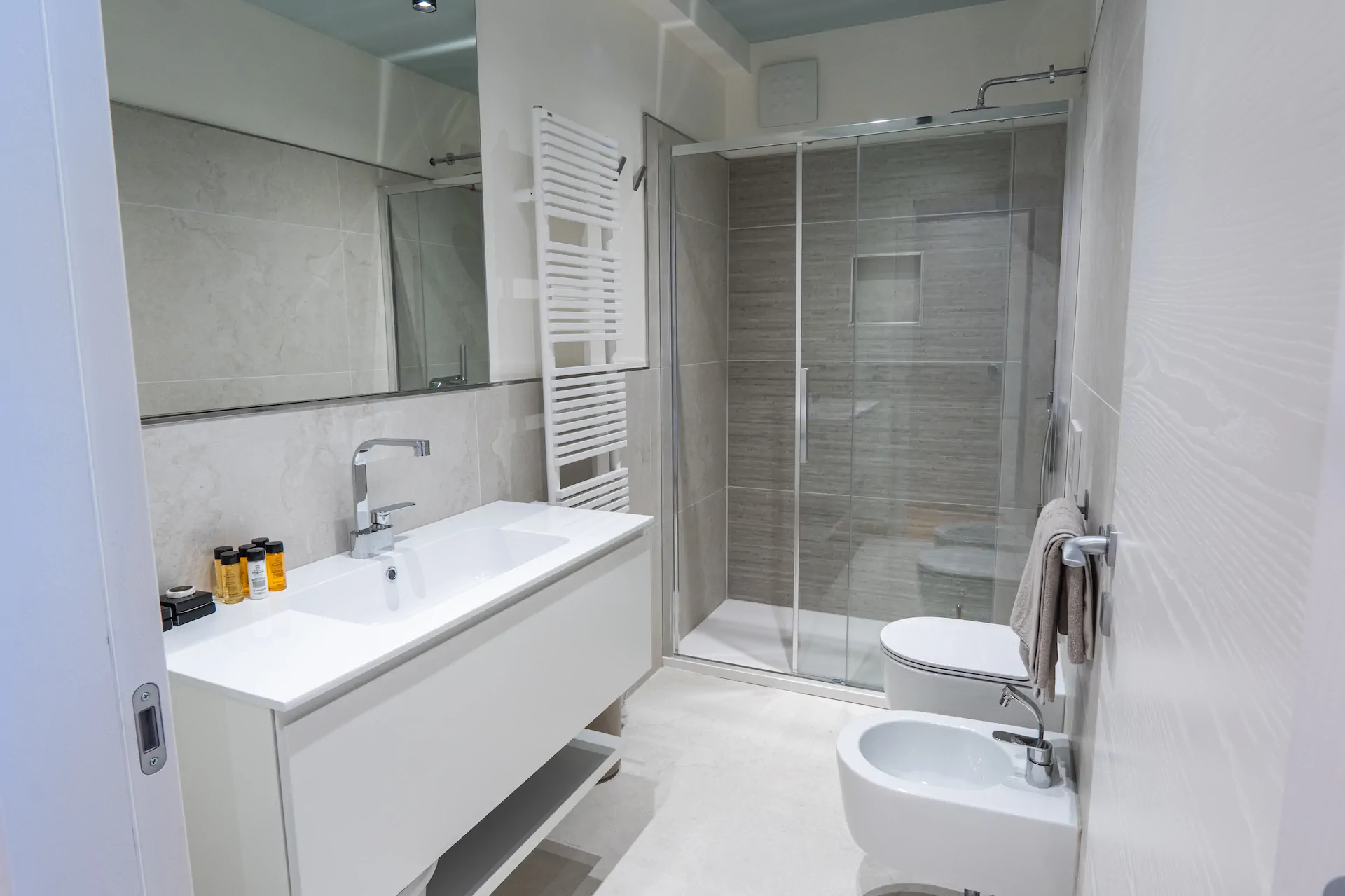 Il bagno è uno spazio essenziale e curato, caratterizzato da finiture moderne e materiali di qualità. La doccia ampia, i sanitari sospesi e l’illuminazione studiata offrono un’esperienza pratica e piacevole, pensata per garantire comfort e benessere in ogni momento della giornata.