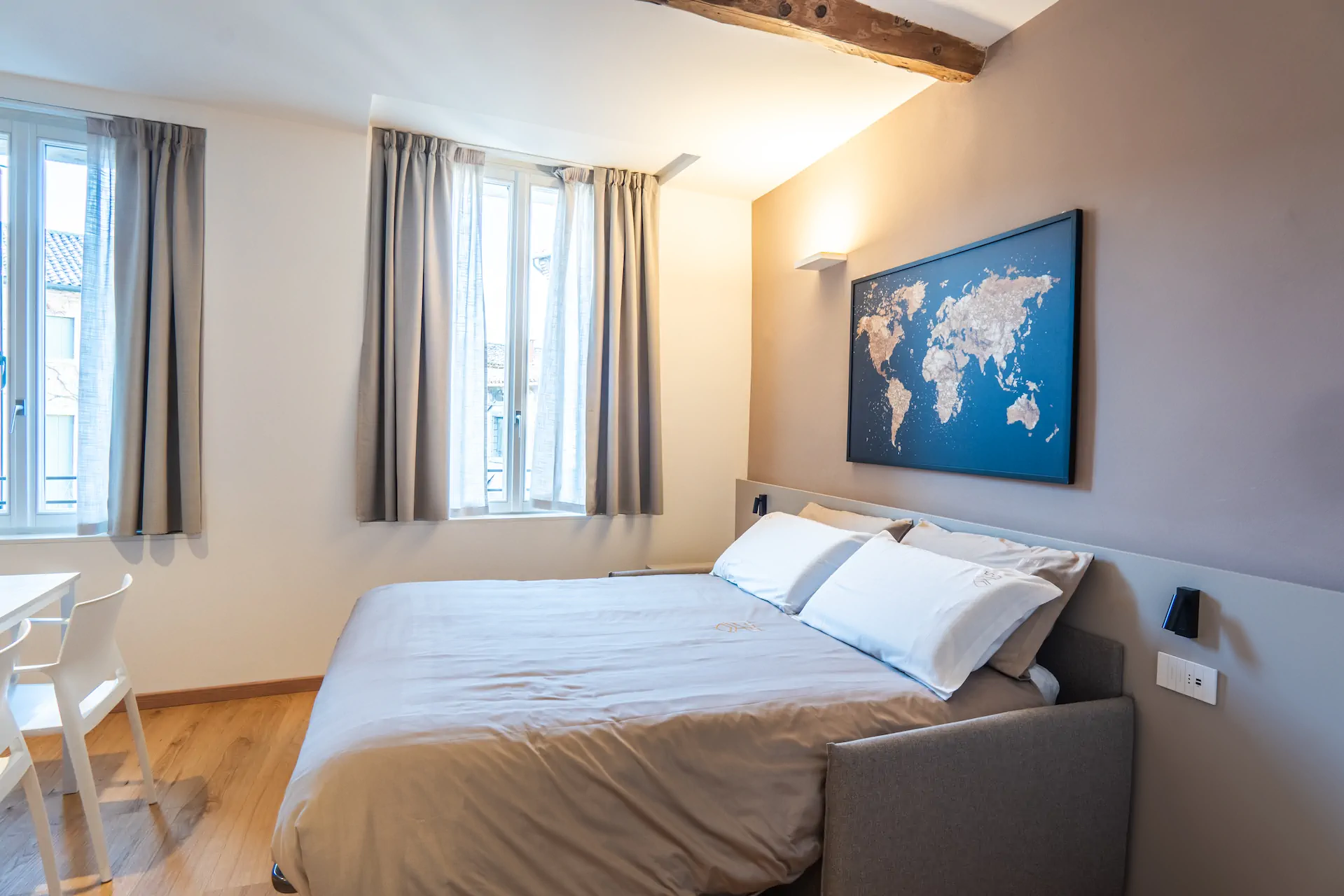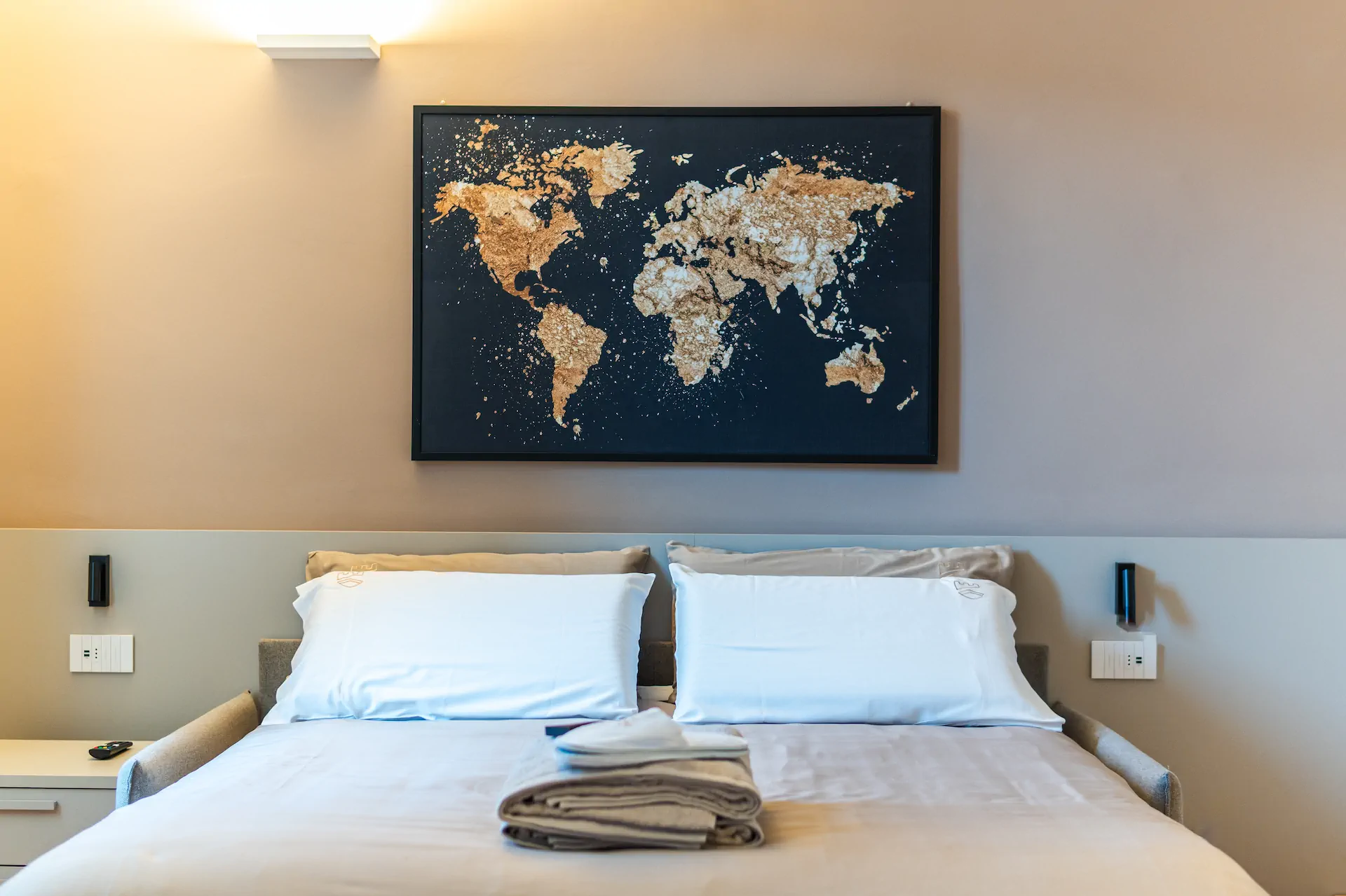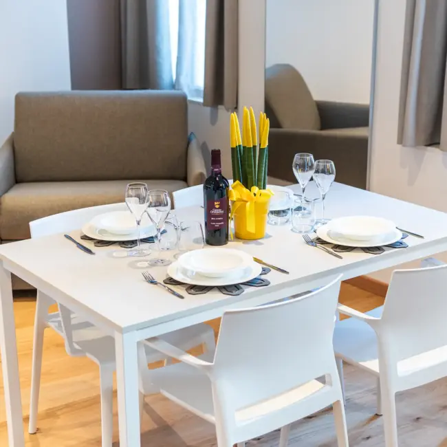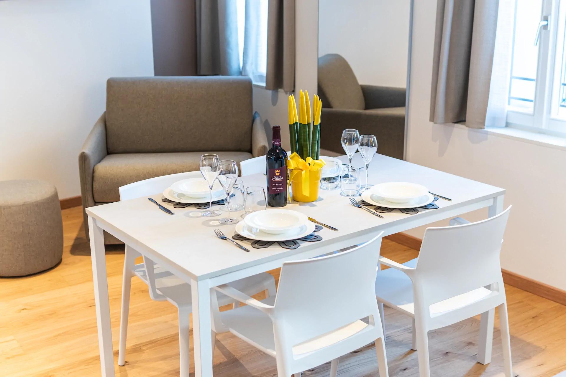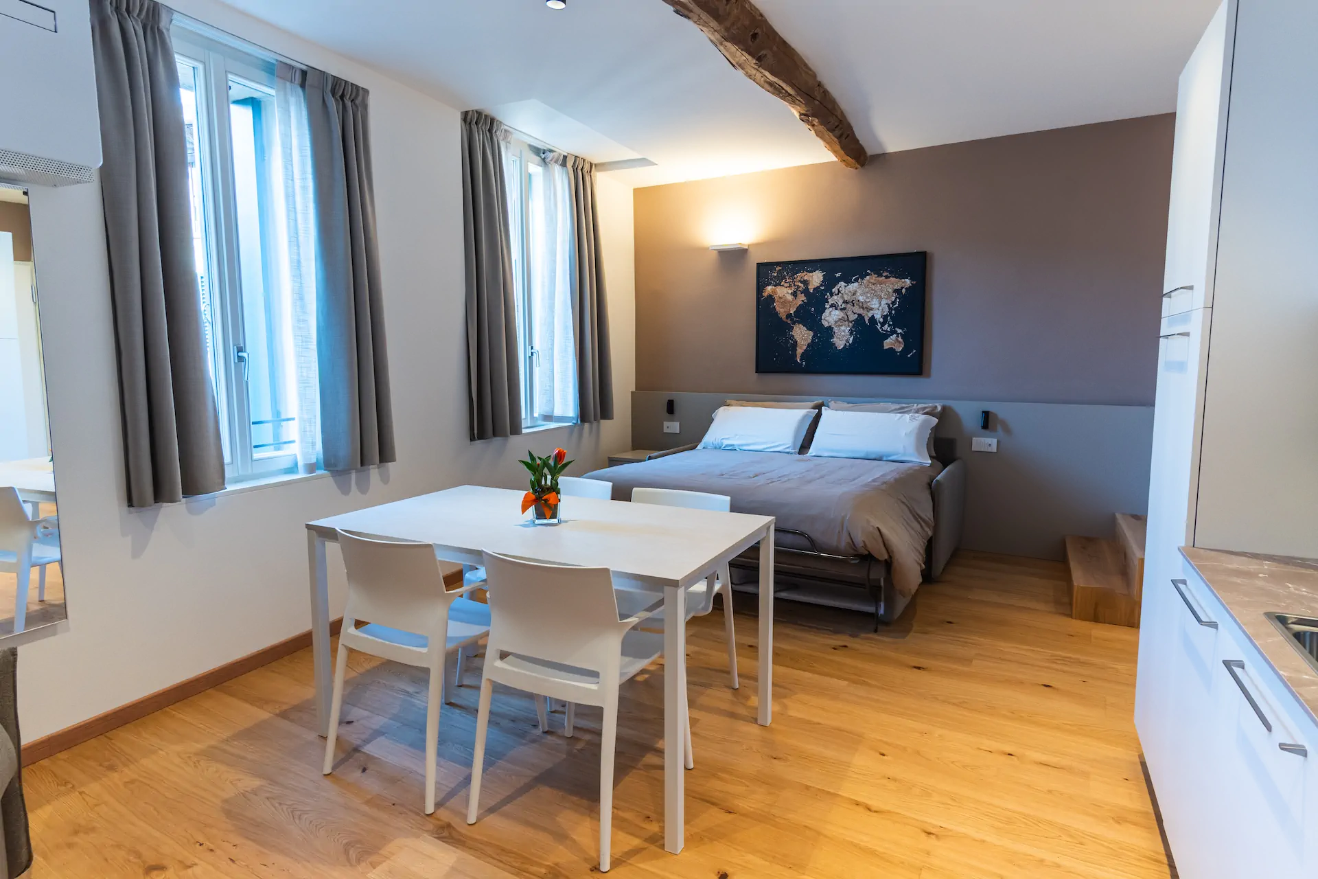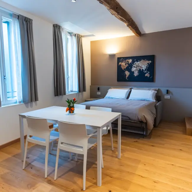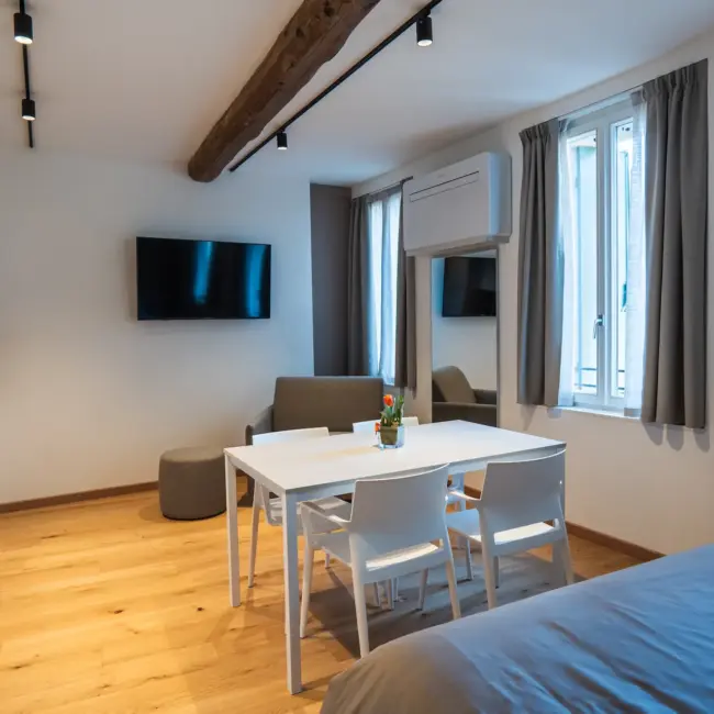La zona notte è integrata con equilibrio all’area living, offrendo un letto matrimoniale confortevole e ben inserito nel contesto. Il soggiorno, con tavolo da pranzo e area relax, è progettato per vivere l’appartamento in modo pratico, senza rinunciare allo stile. La disposizione degli spazi garantisce privacy, comodità e libertà di movimento, anche durante soggiorni più lunghi.